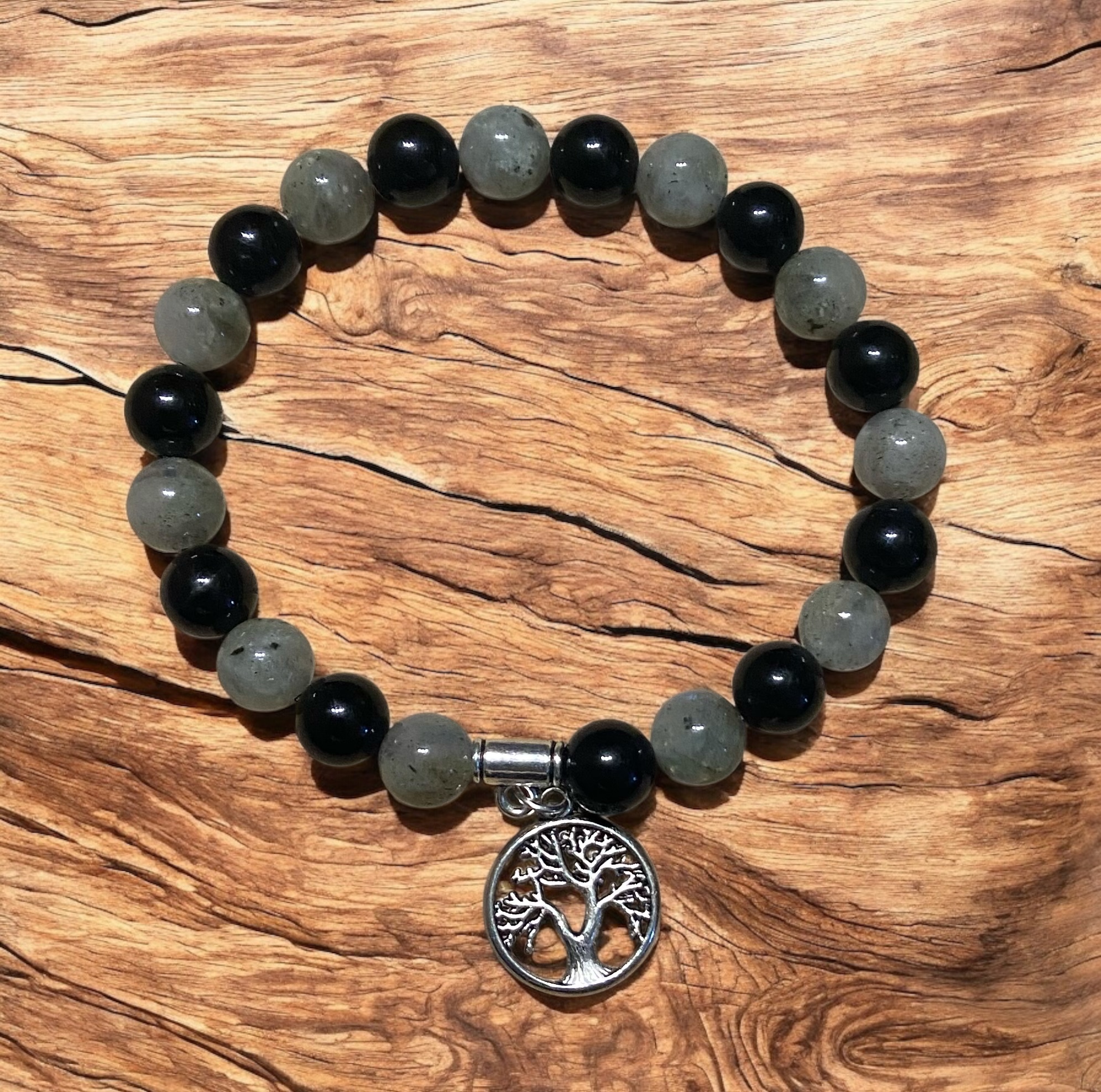 Tourmaline noire, Labradorite, breloque arbre de vie