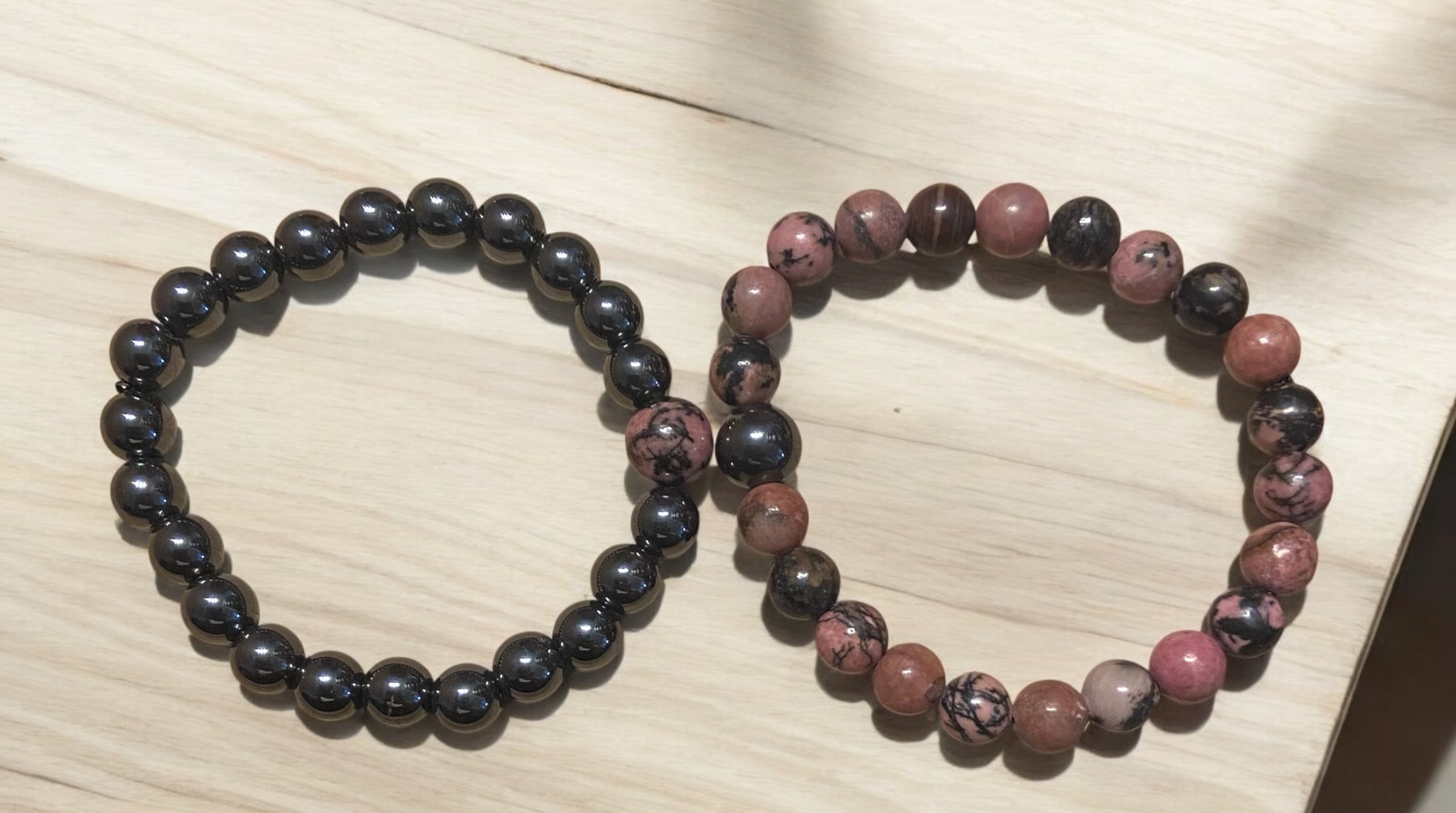 Bracelets connectés Hématite et Rhodonite : perles 8mm, une perle 10mm