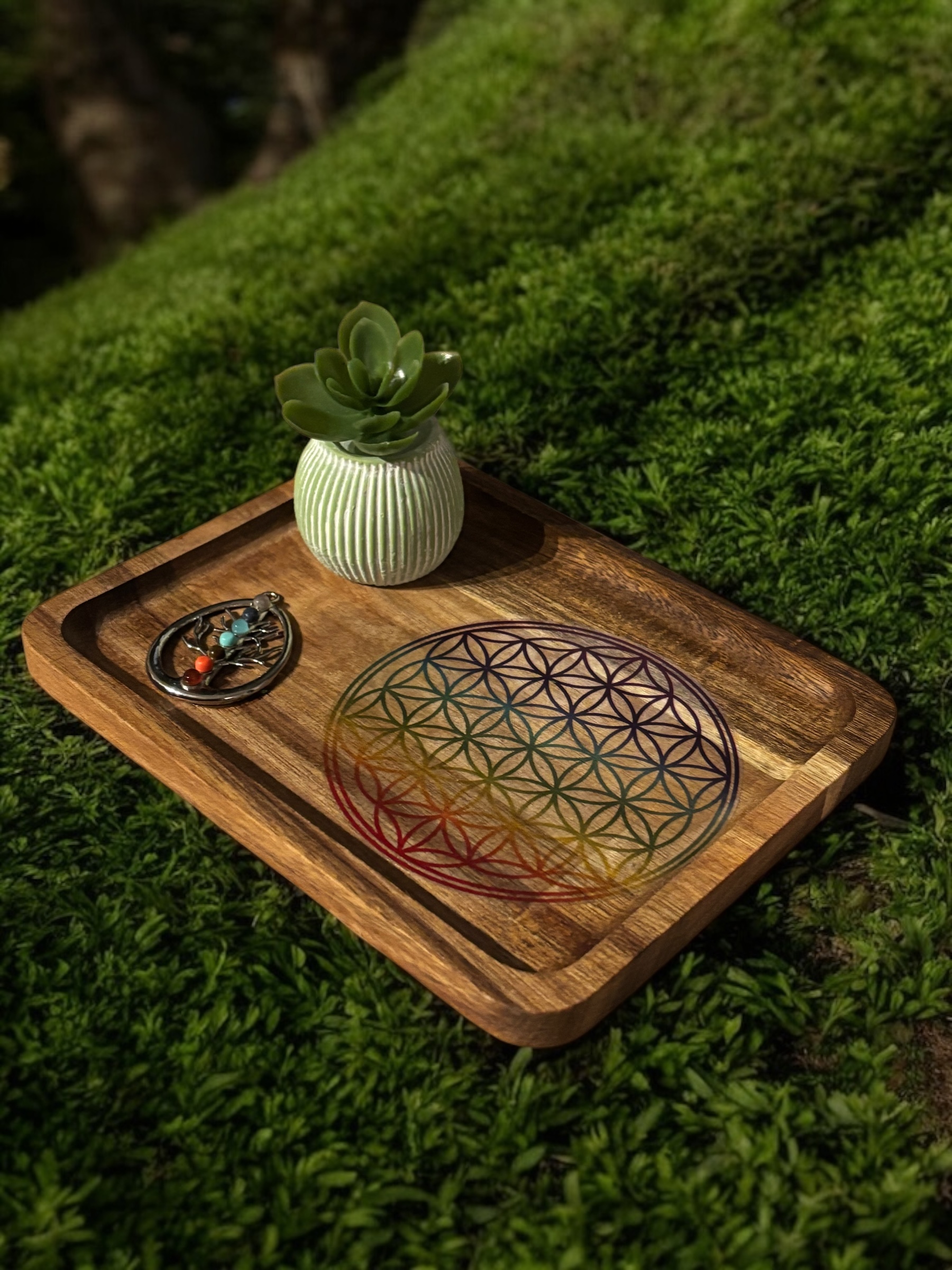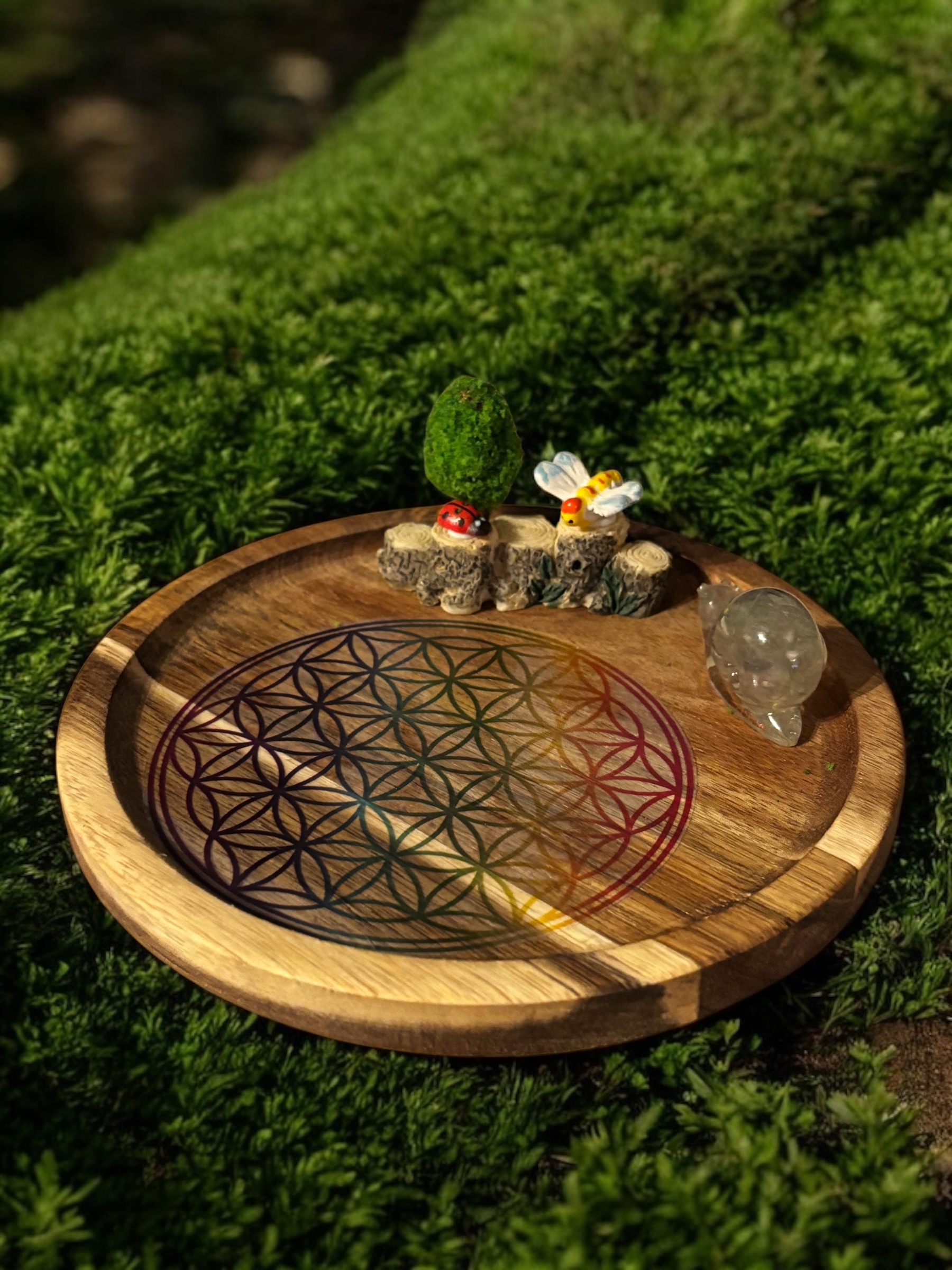 Plaque de recharge avec fleur de vie pour recharger vos pierres et profiter d’un petit monde décoratif.